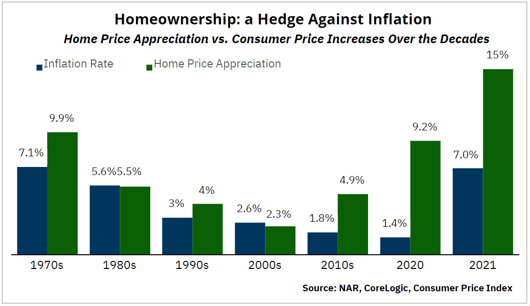 To help give you more context, here’s a look at how home prices have performed compared to inflation since the 1970s. When prices rise, the value of your home does too. And when you’re looking to protect yourself from rising costs, you want to be in a fixed asset that typically outperforms the rate of inflation. As history shows, that makes buying your next home a great hedge during periods of high inflation.
