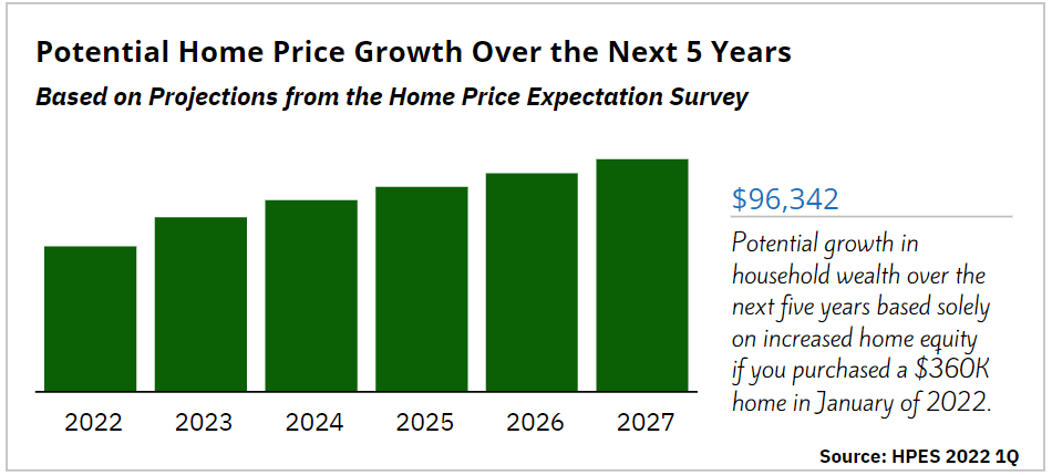 The graph below uses the most recent projections from the Home Price Expectation Survey (HPES) by Pulsenomics to show how your household wealth is expected to continue building as home values rise.