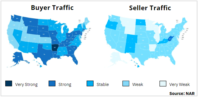 Notice there's more dark blue on the left. This shows buyer traffic (demand) is strong or stable. In contrast, the lighter blues on the right indicate weak or very weak seller traffic (supply). In a nutshell, the demand for homes is greater than what’s available to purchase.