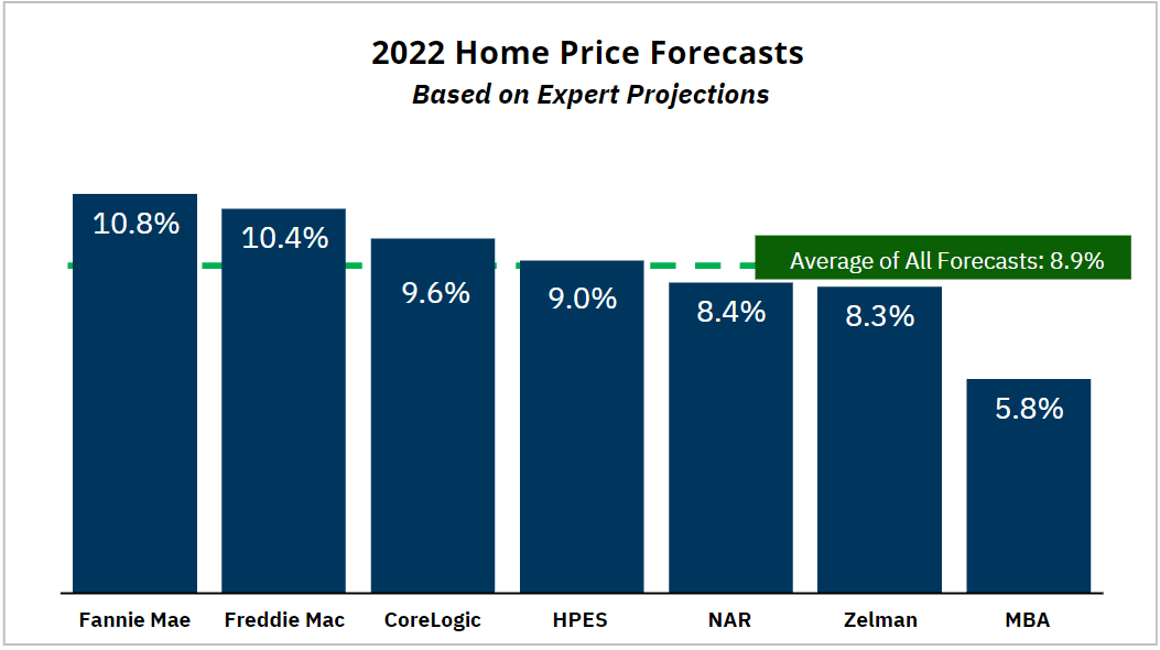 The graph below shows 2022 home price forecasts from several industry experts. The average of these projections indicates an expected 8.9% home price appreciation in 2022. While this isn’t quite the dramatic 15% the market experienced last year, it shows experts are calling for ongoing appreciation. Basically, experts are all indicating home values will continue to climb, just at a more moderate pace.