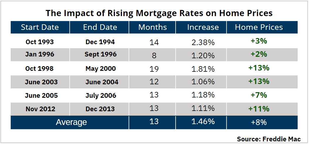 To give you historical context, here’s a look at the impact on home prices over the past 30 years when mortgage rates rose by a percentage point or more. As the chart below shows, rates jumped by at least 1% six times in that time frame. In each case, home values increased. So, if you’re planning to sell, history shows rising mortgage rates have not had a negative impact on home prices.